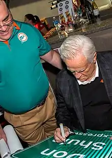 Former NFL Coach Don Shula autographs a "Don Shula Expressway" sign for a fan during an event in Pinecrest, Florida.
