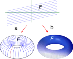 Flat bundles fit into the framework of fiber bundles. A map π : M → B between manifolds is a fiber bundle if there is a manifold F such that each b ∈ B has an open neighborhood U such that there is a homeomorphism with , with p1 : U × F → U projection to the first factor. The fiber bundle yields a foliation by fibers . Its space of leaves L is homeomorphic to B, in particular L is a Hausdorff manifold.