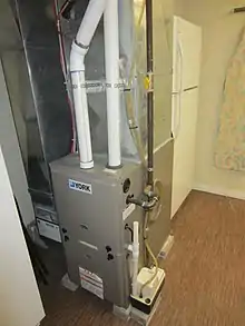 Gas-fired forced-air furnaces have a burner in the furnace fuelled by natural gas. A blower forces cold air through a heat exchanger and then through duct-work that distributes the hot air through the building.[2] Each room has an outlet from the duct system, often mounted in the floor or low on the wall – some rooms will also have an opening into the cold air return duct. Depending on the age of the system, forced-air gas furnaces use either a pilot light or a solid-state ignition system (spark or hot surface ignition) to light the natural gas burner.[3] The natural gas is fed to buildings from a main gas line. The duct work supplying the hot air (and sometimes cool air if an AC unit is tied into the system) may be insulated. A thermostat starts and stops the furnace to regulate temperature. Large homes or commercial buildings may have multiple thermostats and heating zones, controlled by powered dampers. A digital thermostat can be programmed to activate the gas furnace at certain times. For example, a resident may want the temperature in their dwelling to rise 15 minutes before returning from work.[4]