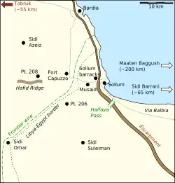 Fort Capuzzo (Italian: Ridotta Capuzzo) was a fort in the colony of Italian Libya, near the Libya–Egypt border, next to the Italian Frontier Wire. The Litoranea Balbo (Via Balbo) ran south from Bardia to Fort Capuzzo, 8 mi (13 km) inland, west of Sollum, then east across the Egyptian frontier to the port over the coastal escarpment. The fort was built during the Italian colonial repression of Senussi resistance in the Second Italo-Senussi War (1923–1931), as part of a barrier on the Libya–Egypt and Libya–Sudan borders.