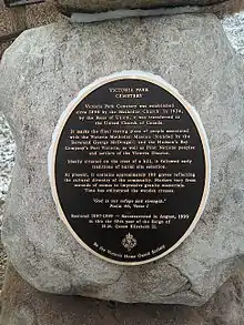 The Victoria Park Cemetery was established circa 1896 by the Methodist church and is located on a hill overlooking the river. It is the second of six cemeteries established in the settlement. It contains approximately 100 recognizable graves from both Native and Settler communities, likely including victims of an 1870 smallpox epidemic.[19] It was restored and rededicated in 1999.[17]
