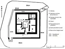 The fort itself, a 24 m square, has a wall 1.80 m thick with a single opening, in the south. Above this gate was a hourd, a kind of wooden hut, designed to allow firing down onto assailants. The holes for the supporting structure are still visible.[1]