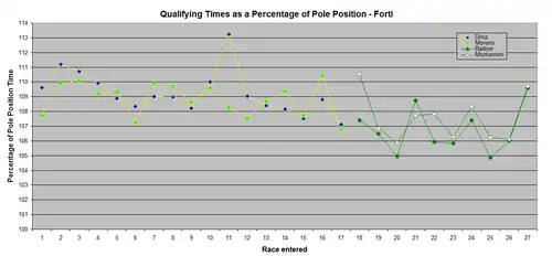 A graph showing the Forti team's qualifying performances as a percentage of the pole position time throughout its involvement in Formula One. The 107% rule introduced for 1996 was a contributary factor to the team's failure mid-season.