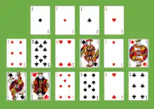 First, the four aces are removed from the deck and placed in a row to form the bases of the foundations. These foundations are built up by suit to kings.