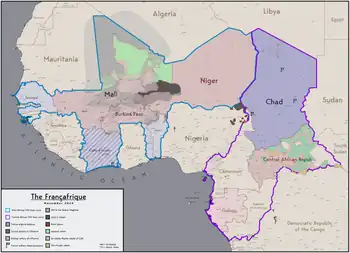 During the 2020s in the Coup Belt, the military juntas of Burkina Faso, Mali, and Niger cancelled military agreements that allowed for French troops to operate on their territory, and in the case of Mali, removed French as an official language.[42][43][44][45][46]