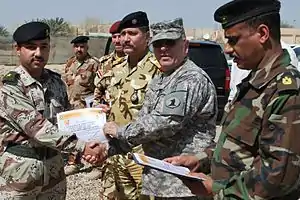 Major General Vavala presents an Iraqi army graduate of the Baghdad Signal University his diploma upon graduation at Camp Victory, Baghdad, Iraq, in 2009.