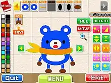 In Freakyforms, players must first create an on-screen character, known as a "Formee". Formees are created using various shapes placed however the player decides. After the character is completed, players use the touch screen to navigate the Formee throughout the game world.[2] As the player explores, they are asked to complete assigned tasks within a given time limit, such as collecting a number of items, eating certain items or assisting other characters.[2] With continued play, additional features are unlocked, such as using the handheld's augmented reality features to take pictures of their creations in a real-world setting.[3] Users may share their Freakyforms content by using the Nintendo 3DS system's StreetPass feature or by creating QR codes that can be scanned using the system's outer cameras.[3]