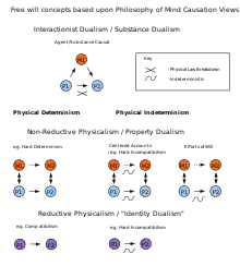 Various definitions of free will that have been proposed for Metaphysical Libertarianism (agent/substance causal,[59] centered accounts,[60] and efforts of will theory[29]), along with examples of other common free will positions (Compatibilism,[17] Hard Determinism,[61] and Hard Incompatibilism[33]). Red circles represent mental states; blue circles represent physical states; arrows describe causal interaction.