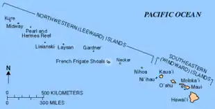 The French Frigate Shoals (Hawaiian: Kānemilohaʻi) is the largest atoll in the Northwestern Hawaiian Islands. Its name commemorates French explorer Jean-François de La Pérouse, who nearly lost two frigates when attempting to navigate the shoals. It consists of a 20-mile-long (32 km) crescent-shaped reef, twelve sandbars, and the 120-foot-high (37 m) La Pèrouse Pinnacle, the only remnant of its volcanic origins. The total land area of the islets is 61.508 acres (24.891 ha), while the total coral reef area of the shoals is over 232,000 acres (94,000 ha). Tern Island, with an area of 26.014 acres (10.527 ha), has a landing strip and permanent habitations for a small number of people. It is maintained as a field station in the Hawaiian Islands National Wildlife Refuge by the United States Fish and Wildlife Service. The French Frigate Shoals are about 487 nautical miles (902 km; 560 mi) northwest of Honolulu. Among the shoals are Tern, which is unique in having an airstrip and is protected by a seawall, and La Perouse Pinnacle, a tall and rocky island in the center of the shoals. The two largest islands after Tern, East and Trig have mostly washed away, with East being about half the size from storms, but are famed as breeding grounds for turtles. East was also home to Coast Guard base in the late 20th century. The islands are surrounded by a coral reef, and the islands themselves are noted breeding ground for turtles, seals, and birds. Habitation is difficult with little vegetation and no fresh water. In the 20th century the French Frigate Shoals are also called Lalo as part of the marine nature reserve, and along with other islands are visited periodically for research. The highest point in the shoals is on La Perouse Pinnacle which is a volcanic rock that rises 122 ft (37 m) above the surrounding lagoon.[1][2]