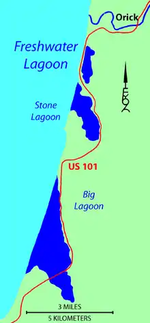 The lagoons are shallow bays between rocky headlands where coastal wave action has formed a sandy bar separating each lagoon from the Pacific Ocean. The lagoons are resting areas for migratory waterfowl using the Pacific Flyway between Lake Earl on the Smith River estuarine wetlands, which is 40 mi (64 km) to the north, and Humboldt Bay on the Mad River estuarine wetlands, which is 30 mi (48 km) to the south.