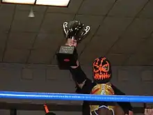 After managing to pin Crossbones in an eight-man tag team match on March 20, Mike Quackenbush suggested that Frightmare should start going after the Young Lions Cup.[23] Frightmare received his shot at the Cup on June 26, but was defeated when the champion, BDK member Tim Donst, choked him out with a necktie.[24] On August 27, Frightmare entered the eighth annual Young Lions Cup tournament, defeating Brendan Michael Thomas, who had eliminated him from the tournament the previous year, in his first round match.[25] Later that same night, he defeated Christian Abel, Kaio, Amasis, Johnny Gargano and Akira Tozawa in a six-way elimination match to advance to the finals of the tournament.[25] On August 29 Frightmare defeated BDK member Lince Dorado to win the eighth Young Lions Cup tournament and score Chikara's first major victory in its war against BDK.[26] Frightmare made his first successful defense of the Young Lions Cup on September 19, defeating BDK's Pinkie Sanchez.[27] On October 23 Frightmare successfully defended the Young Lions Cup against Johnny Gargano, who cashed in his "Golden Opportunity" to get a title match.[28] The following week Frightmare made his first tour of Japan with Osaka Pro Wrestling.[29][30][31] On December 12, 2010, at the season nine finale, Reality is Relative, Incoherence aligned themselves with Hallowicked's long–time rival UltraMantis Black by saving him from Sinn Bodhi and The Batiri.[32] On March 13, 2011, Frightmare broke Max Boyer's record from 2006 for most successful defenses of the Young Lions Cup, when he defeated Batiri member Obariyon to make his sixth successful defense.[33] On April 15, Frightmare, Hallowicked and UltraMantis Black, now known collectively as the Spectral Envoy, were eliminated from the 2011 King of Trios in the first round by Team Dragon Gate (Akira Tozawa, Kagetora and Super Shisa).[34][35] On June 26, Frightmare defeated Batiri member Kodama to make his seventh and final Young Lions Cup defense.[33] On August 27, he was stripped of the title in time for the ninth annual Young Lions Cup tournament.[33] The Spectral Envoy and the Dark Army (Sinn Bodhi, Kobald, Kodama and Obariyon) faced each other in an eight-man tag team match on September 18, when the former was joined by UltraMantis Black's former Order of the Neo-Solar Temple partner Crossbones. The Spectral Envoy managed to win the match, after Ultramantis pinned Bodhi.[36] Afterwards, Frightmare was sidelined for the next eight months with an injury, before returning on May 20, 2012, during Chikara's tenth anniversary weekend.[34] On September 14, Frightmare, Hallowicked and UltraMantis Black entered the 2012 King of Trios, defeating Mihara, The Mysterious and Handsome Stranger and Tito Santana in their first round match.[34][37] The following day, the Spectral Envoy advanced to the semifinals of the tournament, after defeating their rival team The Batiri.[34] However, following the match, the Spectral Envoy was attacked by members of The Batiri and Ophidian.[38] On the third and final day of the tournament, the Spectral Envoy first defeated F.I.S.T. (Chuck Taylor, Icarus and Johnny Gargano) in the semifinals and then Team ROH (Mike Bennett, Matt Jackson and Nick Jackson) in the finals, despite interference from The Batiri, Delirious and Ophidian, to win the 2012 King of Trios.[34][39][40][41] On December 2 at Chikara's third internet pay-per-view, Under the Hood, the Spectral Envoy, represented by Frightmare, Hallowicked, UltraMantis Black and the returning Blind Rage and Crossbones, defeated The Batiri, Delirious and Ophidian in a ten-man tag team match.[34][42]