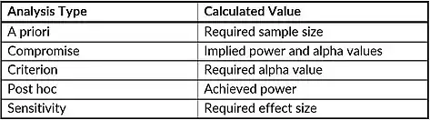 The table lists all possible analyses that the updated G*Power 3.1 can perform for various functions. A priori analyses are one of the most commonly used analyses in research and calculate the needed sample size in order to achieve a sufficient power level and requires inputted values for alpha and effect size. Compromise analyses find implied power based on the beta/alpha ratio, or q, and inputted values for effect size and sample size. Criterion analyses calculate the required alpha value based on the inputted power, effect size, and sample size. Post hoc analyses find actual power based on the inputted alpha, sample size, and effect size. Lastly, sensitivity analyses find the needed effect size given the alpha value, power, and sample size.