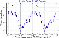 Analysis of the spectrum by C. A. Hernández and associates in 1981 suggested the star is surrounded by a thick, extended envelope that is concealing absorption lines formed in the stellar photosphere. They used measurements of radial velocity variations to estimate a period of 31.03 days.[13] In 1984, E. Gosset and associates used photoelectric photometry to find a period of 31.020 days, but were convinced by the data that the orbital period is twice that value, or 62.039 days.[1] GG Carinae was classified as a supergiant B[e] star by Henny Lamers and associates in 1998, based on properties similar to B[e] supergiants in the Magellanic Clouds.[14]