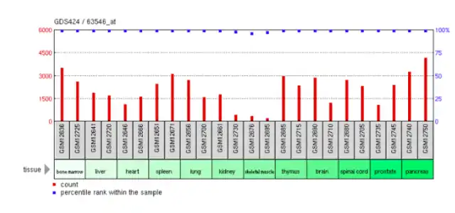 Data from NCBI shows that GOLGA8H in Homo sapiens has the strongest expression is through the thyroid and testis, with RKPMs of 12.2 and 12.1 respectively. It is also expressed in lesser amounts in 25 other tissues.[3] Data from GEO DataSet show the tissue expression is highest in bone marrow and pancreas tissue.[17] However, samples from all tissues were above the 90th percentile, indicating that the expression value of that gene is much higher in respect to all other genes on the array.[17]