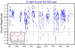 A visual band light curve for GQ Lupi. The main plot (from ASAS data[1]), shows the long-term variability, and the inset plot (adapted from Broeg et al.[2]) shows the short-term periodic brightness variation.