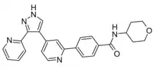 - ↑ Gellibert F, de Gouville AC, Woolven J, Mathews N, Nguyen VL, Bertho-Ruault C, et al. (April 2006). "Discovery of 4-{4-[3-(pyridin-2-yl)-1H-pyrazol-4-yl]pyridin-2-yl}-N-(tetrahydro-2H- pyran-4-yl)benzamide (GW788388): a potent, selective, and orally active transforming growth factor-beta type I receptor inhibitor". Journal of Medicinal Chemistry. 49 (7): 2210–2221. doi:10.1021/jm0509905. PMID 16570917.