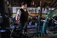 Winding engine at Blists Hill. The red handwheel is the steam stop valve, the lever in front of the engine driver disengages the valve gear gab.