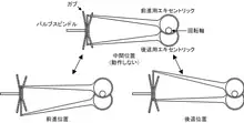A better solution was to use a single double-sided gab. These were initially X-shaped and sat between the two connecting pins.[5] X-gabs were also usually reversed, so that the gab was placed on the valve spindle and the pins were instead connected to the eccentric rods. The gab now stayed still vertically and the pins were moved up and down to engage them. This was done by joining both pins with a short vertical bar. The driver's reversing lever[note 1] moved the centre of this bar, thus the pins, up and down to engage one at a time with opposite faces of the X-gab. This valve gear was used on Stephenson's locomotives of the early 1830s, such as Rocket.