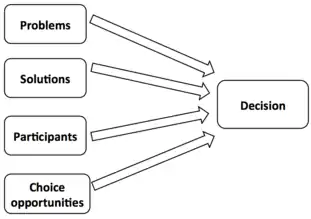 The first three streams of problems, solutions, and participants, flow into the fourth stream of choice opportunities, and mix based on chance, timing, and who happens to be present.[2]