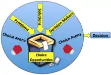 While the first three streams of problems, solutions, and participants, meet in the stream of choice opportunity (for example, a choice to hire a new employee), the decision/choice arena is the larger domain where all four of these streams meet.[2][1] This arena can be the type of organization (government, school, university) or the greater setting in which this interaction is occurring. For example, a board or committee may be a choice arena, while the committee's annual elections may be a choice opportunity. Choice opportunities may also move between different choice arenas, such as a decision being passed between committees, or departments.[2]