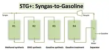 A third gas-to-liquids process builds on the MTG technology by converting natural gas-derived syngas into drop-in gasoline and jet fuel via a thermochemical single-loop process.[8]