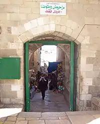 The Cotton Merchants' Gate (Arabic: باب القطانين Bāb al-Qaṭṭānīn Hebrew: שער מוכרי הכותנה) leads onto the Temple Mount. It was built by the ruler of Damascus, Tankiz, during the reign of Mamluk Sultan ibn Qalawun, as marked by an inscription over the door.[14] Since this site is the closest a person can get to the Foundation Stone without setting foot on the mount itself, the gate was a popular place of prayer for Jews during the 19th century.