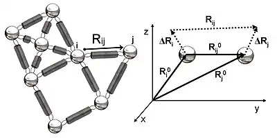 • Spring bead based network model: In spring-bead based network model, the springs and beads are used as components in the crosslinked network. Springs are cross-linked to represent mechanical behavior of the material and bridge molecular dynamics (MD) model and finite element (FE) model (see Figure. 5). The beads represent material mass of cluster bonds. Each spring is used to represent a cluster of polymer chains, instead of part of a single polymer chain. This simplification allows to bridge different models at multiple length scales and improves the simulation efficiency significantly. At each iteration step in the simulation, forces in the springs are applied to the nodes at the center of the beads, and the equilibrated nodal displacements throughout the system are calculated. Different from the traditional FE method for obtaining stress and strain, the spring–bead model provides the displacements of the nodes and forces in the springs. The equivalent strain and strain energy of spring–bead based network model can be defined and calculated using the displacements of nodes and the spring characteristics. Furthermore, the results from the network model can be scaled up to obtain the structural response at the macroscale using FE analysis.[11][12]