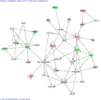 Ingenuity Gene Network Diagram[22] which dynamically assembles genes with known relationships. Green indicates reduced expression, red indicates increased expression. The algorithm has included unregulated genes, white, to improve connectivity.