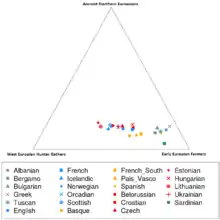 - ↑ Lazaridis, Iosif; et al. (2014). "Ancient human genomes suggest three ancestral populations for present-day Europeans". Nature. 513 (7518): 409–413. arXiv:1312.6639. Bibcode:2014Natur.513..409L. doi:10.1038/nature13673. PMC 4170574. PMID 25230663.