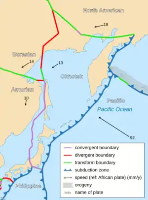The Okhotsk-Chukotka Volcanic Belt was formed during the Cretaceous by the subduction of the Kula or Isanagai oceanic plate under the Verkhoyansk-Chukotka orogen. The activity ended with the subduction moving farther east.[46]