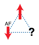 Geometrical frustration is an important feature in magnetism, where it stems from the relative arrangement of spins. A simple 2D example is shown in Figure 1. Three magnetic ions reside on the corners of a triangle with antiferromagnetic interactions between them; the energy is minimized when each spin is aligned opposite to neighbors. Once the first two spins align antiparallel, the third one is frustrated because its two possible orientations, up and down, give the same energy. The third spin cannot simultaneously minimize its interactions with both of the other two. Since this effect occurs for each spin, the ground state is sixfold degenerate. Only the two states where all spins are up or down have more energy.
