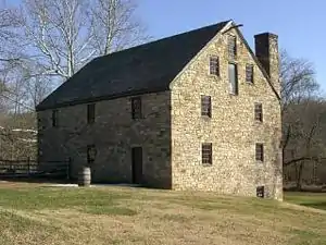 George Washington's Gristmill was part of the original Mount Vernon plantation, constructed during the lifetime of the United States' first president. The original structure was destroyed about 1850. The Commonwealth of Virginia and the Mount Vernon Ladies’ Association have reconstructed the gristmill and the adjacent distillery. The reconstructed buildings are located at their original site three miles (4.8 km) west of the Mount Vernon mansion near Woodlawn Plantation in the Mont Vernon area of Fairfax County. Because the reconstructed buildings embody the distinctive characteristics of late eighteenth century methods of production and are of importance to the history of Virginia, the site is listed on the National Register of Historic Places despite the fact that the buildings are not original.