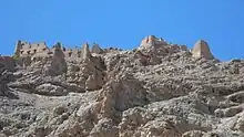 The mountain top has its own fortifications. There is a citadel 30.5 metres (100 ft) in length and 24 metres (79 ft) in width. Its base is built with dressed blocks of stone and features a well in the middle. The main inhabited area, which is visible from the plain, was a complex of two rows of buildings on the south-eastern slope, all of them at least two or three stories high. On the north-east, there is a late mud wall with little remnants of buildings. On the south-west there is a cistern and remains of a defensive tower. The main water catchment area is, however, the three cisterns on the southern side of the hilltop where the ground drops steeply about 60.5 metres (198 ft). They feature an outer wall of 3 metres (9.8 ft) in thickness made of stone and mud-brick covered by plaster, with vaulted roofs and turrets. There are more cisterns and wells elsewhere within the fortifications.[5]