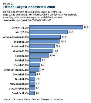 For over three centuries, immigration from Germany accounted for a large share of all American immigrants. As of the 2000 US Census, more than 20% of all Americans, and 25% of white Americans, claim German descent. German-Americans are an assimilated group which influences political life in the US as a whole. They are the most common self-reported ethnic group in the Northern United States, especially in the Midwest. In most of the South, German Americans are less common, with the exception of Texas.[16]