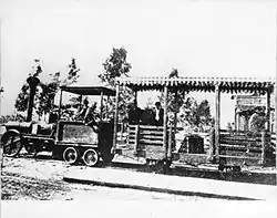 the little engine was a very primitive affair. It was so constructed that it had to be started with a metal bar, and was covered with a wooden jacket which used to catch fire when the boiler was hot enough to make a good steam. Then, since the water in the boiler had to be used to extinguish the fire, the steam would go down and the engine refuse to run ... It ran fairly well on level ground, but on a rise it was apt to stop entirely till the male passengers got out and applied the iron bar with considerable force.[1]