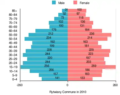 According to the 2011 Poland census, there were 6,240 people residing in Rytwiany Commune, of whom 49.2% were male and 50.8% were female. In the commune, the population was spread out, with 20.7% under the age of 18, 38.4% from 18 to 44, 22.9% from 45 to 64, and 18% who were 65 years of age or older.[1]