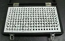 These gauges are referred to as plug gauges; they are used in the manner of a plug. They are generally assembled from standard parts, where the gauge portion is interchangeable with other gauge pieces (obtained from a set of pin type gauge blocks) and a body that uses the collet principle to hold the gauges firmly. To use this style of gauge, one end is inserted into the part first, and depending on the result of that test, the other end is tried.[3]