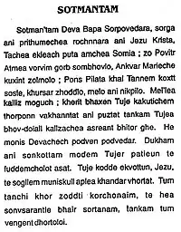 In Bombay Konkani periodicals such as O Concani, a weekly by Sebastiāo Jesus Dias, Sanjechem Noketr (The Evening star) (1907) by B.F. Cabral, O Goano (1907) by Honarato Furtado and Francis Futardo, divide into three sections: Portuguese, Konkani and English, Popular Magazine by first as monthly then a fortnightly and Ave Maria (1919), a Konkani-English-Portuguese trilingual edited by Antonio D'Cruz were published.[17] In February 1899, Udentenchem Sallok (Lotus of the East), a Konkani-Portuguese bilingual by Eduardo J. Bruno de Souza, the first Konkani periodical was published as a fortnightly in Poona. In Sholapur, the first Konkani book in the Devanagri script Kristanv Doton ani Katisism (1894), by Dr. George Octaviano Pires was published.[25] Other periodicals that took birth Bombay from 1936 to 1950 included Udentechem Nektr (The Morning star), Niz Goa, Jai Gomantak, Gomant Bharti, Voice of Goa, Azad Goem, Sot Uloi, Porjecho Avaz and Ghe Uzvadd were published. Periodicals like Mhojem Magazin, Catholic Indian, Amcho Sonvsar, Novo Jivit, Goenkaracho Ixxt, Porjecho Ulas, Golden Goa, Konkani Times, Sontos, Aitarachem Vachop, O Heraldo, Konknni Journal and Tujem Raj Amkam Ieum were circulated from Bombay.[17] In Karachi, Fr.Ludovico Pereria's monthly Dor Mhoineachi Rotti (Monthly bread, 1915) was published.[15][18]