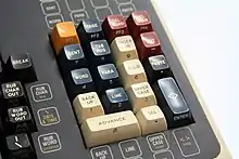 It is used within WPS, EDT, and many other common VAX programs.[1] The key, typically located as the upper leftmost key on the numeric keypad on different terminals,[2] was not necessarily colored gold. Some DEC terminals would include keyboards where the gold key was labeled PF1, as on the VT100 and VT200, or was colored blue, as on the VT52.[3] On some keyboards, the normal function of a key would be labeled on the lower portion of the key, while its alternate function activated with the GOLD key would be labeled above it.[2]