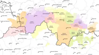 The Gorals inhabit a number of regions collectively referred to as the "Goral lands" (Goral: Góralscýzno, Polish: Góralszczyzna) split between Poland, Slovakia and the Czech Republic. In Poland, the community inhabits the geographical region of Podhale of the Tatra Mountains and parts of the Beskids (Cieszyn Silesia, Silesian Beskids, Żywiec Beskids).[32][33][34] After 1945, some Górals from Bukovina and the Podhale regions found new homes in Lower Silesia in villages such as Krajanów, Czarny Bór, and Borówna in the Central Sudete Mountains, as well as Złotnik, Brzeźnica and Lubomyśl in Lubusz Voivodeship.