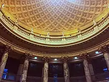 The circular reading room was designed as the centerpiece of the library and was surrounded by three levels of stacks.[37] The outer wall of the reading room contains a colonnade of 16 triple-height engaged and fluted Corinthian columns. It is aligned with an inner colonnade of freestanding green Connemara marble columns.[34][38] The colonnades flank a passageway with a floor of white, black, and yellow marble tiles;[36] the passageway measures about 5 ft (1.5 m) wide.[32] A skylight in the middle of the ground floor, measuring 15 ft (4.6 m) across, illuminates the former auditorium in the basement.[39] There are three balconies immediately above the passageway. The second-level balcony contains an iron frame with a glass floor.[32][36] The third-level balcony was decorated more ornately.[36] Above the colonnades is a fourth-level balcony as well as the dome.[34]