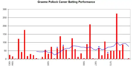 Robert Graeme Pollock (born 27 February 1944) is a former cricketer for South Africa, Transvaal and Eastern Province. A member of a famous cricketing family,[2][3] Pollock is widely regarded as one of South Africa's greatest ever cricketers,[4][5] and as one of the greatest batsmen in the history of cricket.[2][5][6] Despite Pollock's international career being cut short at the age of 26 by the sporting boycott of South Africa, and all but one of his 23 Test matches being against England and Australia, the leading cricket nations of the day,[5] he broke a number of records. His completed career Test match batting average (twenty innings minimum) of 60.97 remains the third best behind Sir Don Bradman and Adam Voges.[7]