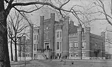 The Grand Lodge of Tennessee established the Masonic University in Clarksville, Tennessee, for the education of the children and orphans of indigent Masons.[1]: 87 The Masonic University began operation 1849 as the "Masonic College" with an enrollment of 105 students.[1]: 88 In 1850, the Grand Lodge completed the main building for the school.[1]: 88 This building became known as Castle Building because of its distinctive architecture, and it stood until its collapse in 1946.[3] In 1855, the Masonic University was purchased by the Presbyterian Church and renamed Stewart College in honor of the college's president.[4][5] Stewart College was later renamed "Southwestern Presbyterian College" in 1875, and renamed "Southwestern" when the school moved to Memphis, Tennessee, in 1925.[5] It was later renamed Rhodes College in 1984.[5] The original campus of the Masonic University is now the site of Austin Peay State University.[3]