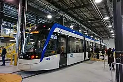 The first light-rail vehicle - a Bombardier Flexity Freedom - on public display in April 2017