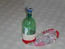 The construction of a bucket bong (or simply a "bucket") calls for a plastic bottle (about 2 litres (0.53 US gal)), a Hex Bit Socket used as the bowl, an aerator screen cut to fit the bowl, and a large bucket or other container into which both the bottle and a sufficient amount of water will properly go. The plastic bottle's base is cut off, and the bottle's cap has a small hole in the center which will eventually hold a bowl. The screen is placed inside of the bowl. The cut nozzle is threaded into the hole outside the cap.[1][2]