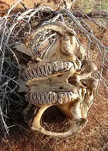 Elephant skull with removed tusks, killed by poachers, Voi area, Kenya