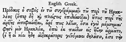 18th-century typeface sample by William Caslon, showing a greatly reduced set of ligatures (-ου- in "τοῦ", end of first line; -στ- in πλείστοις, middle of second line; and the καὶ abbreviation).