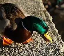 Despite rules against feeding the ducks at Green Lake, this mallard managed to nab some bread from a park goer.