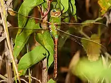 Common green darners are large dragonflies, ranging from 6.8 to 8 centimetres (2.7 to 3.1 in)[13] in length and a wingspan of up to 10 centimetres (3.9 in).[12] Both sexes have an unmarked green thorax. Mature males have bluish-purple abdomens (the first few abdominal segments are the brightest) with a black dorsal stripe that broadens near the end of the abdomen. Immature males and most females have reddish-brown abdomens, but some females are patterned like adult males. Wings are initially clear but usually become amber-tinted with age, especially in females.[12][9] Both sexes have a black ‘bulls-eye’ mark on the face (more precisely, the frons) in front of their eyes, a distinguishing field mark that separates them from the superficially similar comet darner (Anax longipes).[14][12] This species oviposits in tandem which is a unique behavior among North American darners.[14][12]