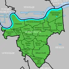 For elections to the Greater London Council, the borough formed the Greenwich electoral division, electing three members. In 1973 it was divided into the single-member Greenwich, Woolwich East and Woolwich West electoral divisions.[24] The Greater London Council was abolished in 1986.
